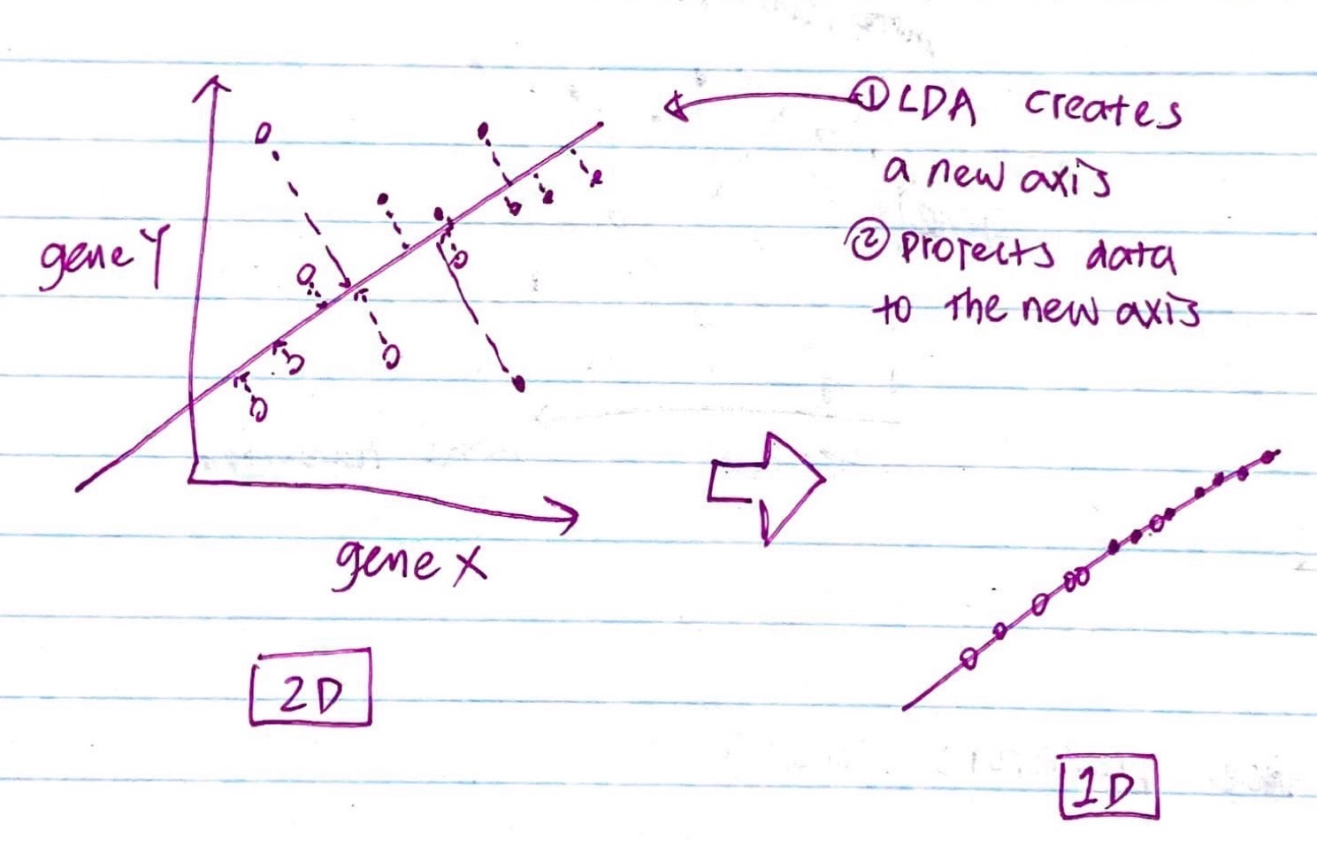 We can’t just simply dropping one of the axis (e.g. gene y) because it will lose data. Instead, LDA creates a new axis and project new data there.